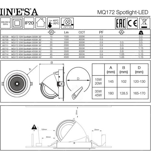Inesa Gimbal Led üzletvilágító, kirakatvilágító, áruvilágító lámpa, spot lámpa, 36°-os szórásszögű, ideális az áru megvilágításhoz, forgatható fejjel. Extra fényerő 20W, 2000 lumen, 4000 kelvin közép fehér. Gipszkartonba, bútorba ideális, csak vágja ki a lyukat és máris berakható! Átmérő 145mm, magasság 102mm, lyukméret 120mm.