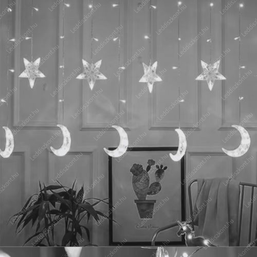 Life Light Led Karácsonyi Led függöny, kül-és beltéri /IP44/ függöny, csillag/hold figurával, 235 db hideg fehér Leddel, időzítős adapterrel, 6H működés, 18H kikapcsolás, adapterrel, a ledek 31 Voltosak, átlátszó kábellel, fogyasztása 3,6W, termék mérete: 2m x 0,84 m, vezeték hossza: 5 m. A ledek nem cserélhetőek! Life Light Led 2 év garancia!