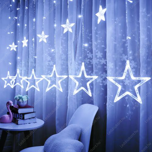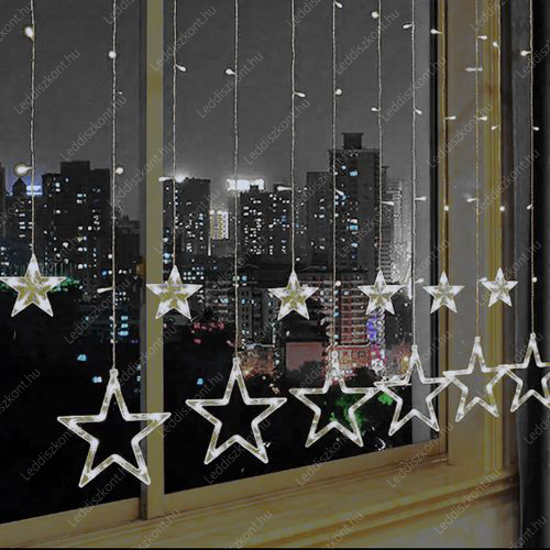 Life Light Led Karácsonyi Led függöny, kül-és beltéri /IP44/ függöny, kis és nagy csillag figurával, 183 db hideg fehér Leddel, időzítős adapterrel, 6H működés, 18H kikapcsolás, adapterrel, a ledek 31 Voltosak, átlátszó kábellel, fogyasztása 3,6W, termék mérete: 2m x 0,84 m, vezeték hossza: 5 m. A ledek nem cserélhetőek! Life Light Led 2 év garancia!
