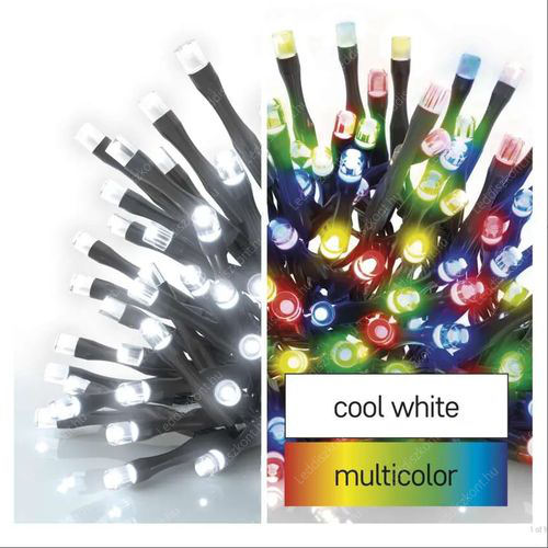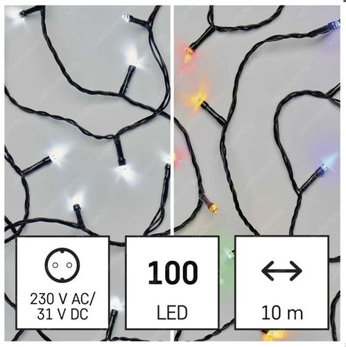 Emos Led karácsonyi rizsszem kül-és beltéri /IP44/ füzér fára, kertbe. Különleges fények, 100db hideg fehér és multicolor /piros-zöld- kék-sárga/ Leddel, villogtatható, 8 funkciós fényprogram, fekete kábellel, 230V adapterrel, a ledek 31 Voltosak, fogyasztása 3,6W, termék hossza: 10 méter, a vezeték hossza: 5 méter. Kiválóan alkalmas esküvőkre, bulikra, teraszokra is! A ledek nem cserélhetőek!