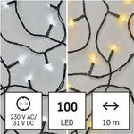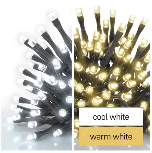 Emos Led karácsonyi rizsszem kül-és beltéri /IP44/ füzér fára, kertbe. Különleges fények, 100db hideg fehér és meleg fehér Leddel, villogtatható, 8 funkciós fényprogrammal, fekete kábellel, 230V adapterrel, a ledek 31 Voltosak, fogyasztása 3,6W, termék hossza: 10 méter, a vezeték hossza: 5 méter. Kiválóan alkalmas esküvőkre, bulikra, teraszokra is! A ledek nem cserélhetőek!