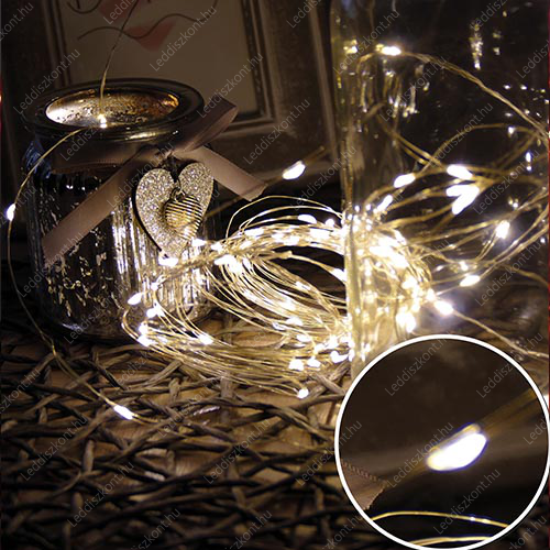 Mikro- Ledes Nano fényfüzér, 100 db meleg fehér Leddel, 8 funkciós, vezérelhető adapterrel! Extra vékony, szinte láthatatlan arany színű réz vezeték, 100 Led, IP44 vízálló. 30 000 óra. Hossz: 9,9 m, tápvezeték 2 m. Használható kül- és beltéren, a ledek 4,5 Voltosak, fogyasztás 3,6 W. Kiválóan alkalmas esküvőkre, bulikra, teraszokra is! Life Light Led 2 év garancia!
