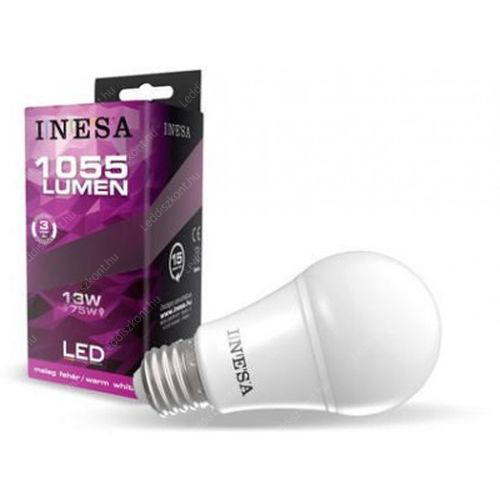 Inesa körte Led 13W, 1055 lumen, 4000 kelvin, közép fehér. Teljes burás 180° sugárzási szög, 60 mm fejátmérő! Ez a alumínium-műanyag házas körte Led megfelel egy hagyományos 80 Wattos hagyományos izzónak! A ledek nem zavaróak, mert nem látszanak. Ez nem körte Led izzó, hiszen nincs benne izzó szál! 30.000 óra élettartam! CE, ROHS. Ennek a termék garantáltan nem vibrál a fénye és így nem bántja a szemet, nem okoz fejfájást/