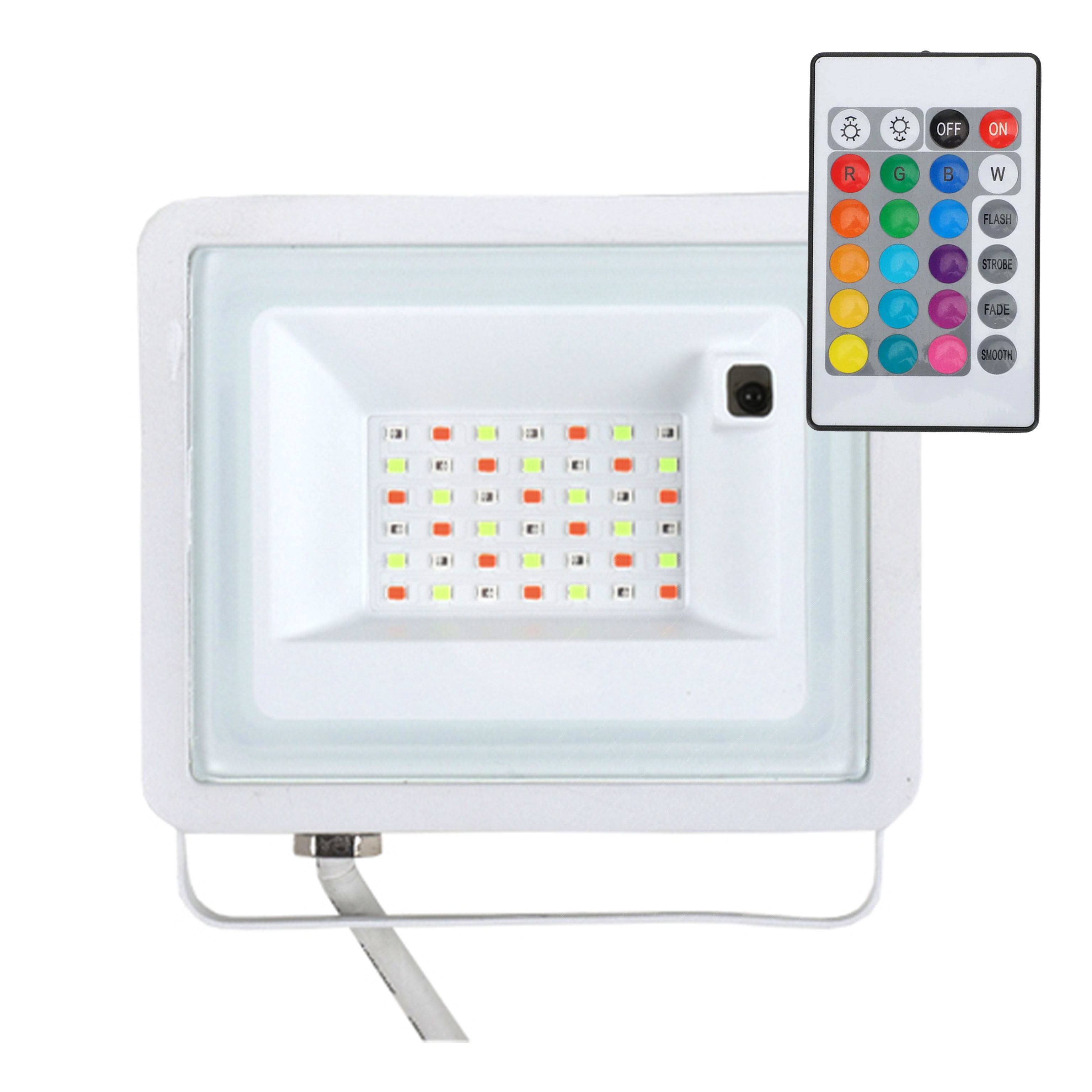 Led reflektor RGB, távirányítós, 30W, 1200 lumen. 208*147*40mm, IP65 vízálló. A 24 gombos távirányítóval lehet színeket keverni, villogtatni, színátmeneteket képezni. Kiválóan alkalmas hangulatfénynek, reklámtáblák, üzlet-kirakat színes megvilágítására! Fehér fénynél 1200 lumen a fényerő, tehát akinek főleg a fehér fényre van szüksége, az a normál hideg vagy fehér fényű reflektorok közül válasszon! A termék -20+40C között működik, ettől eltérő körülmények esetén a termék tönkremegy és a garanciát elveszíti! Life Light Led 2 év garancia!