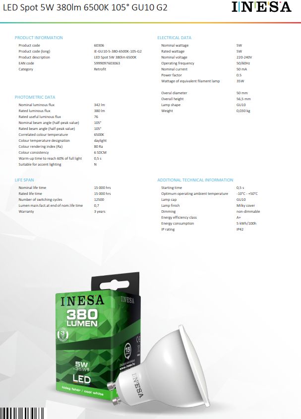 Led spot, GU10 4W, 346 lumen, erősebb, mint egy 40 wattos halogén. 6500 kelvin, hideg fehér. Szórásszög 100°. Ez a led égő kiválóan alkalmas tárgyak, polcok üzletterek megvilágítására! Ez egy led spotégő vagy led fényforrás, nem led izzó! Bármelyik spot keretbe/ lámpatestbe belefér! Csak a leddiszkontban: A lumen vizsgálati jelentés megtalálható a termék alatt, a Fény- és teljesítménymérési jegyzőkönyv, Letöltés menüpontban! 2 év garancia!