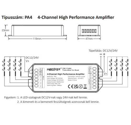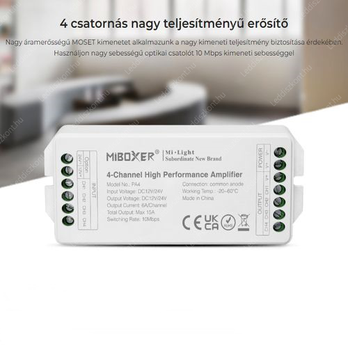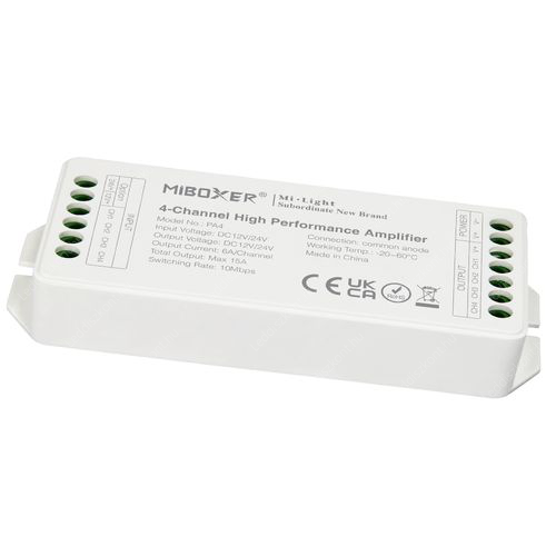 Mi-Light PA4, 4 csatornás nagy teljesítményű erősítő. DC12 / DC24V. Max 15A. Üzemhőmérséklet -20-60°C. Kompatibilis a Mi-Light / MiBoxer sorozatú vezérlőkkel és a piacon kapható összes PWM típusú LED vezérlővel. A fővezérlő jelét teljesen és szinkronban tudja kiadni. Nagy áramerősségű MOSET kimenetet alkalmazunk a nagy kimeneti teljesítmény biztosítása érdekében. Használjon nagy sebességű optikai csatolót 10 Mbps kimeneti sebességgel.