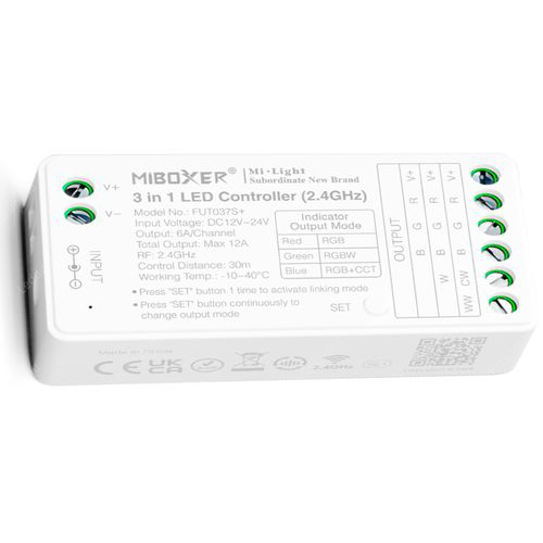 Mi-Light FUT037S+ Led szalag vezérlő RGB+RGBW+RGB+CCT Led szalaghoz, rádiós. DC12V~24V: csatornánkként 6A, 12V maximum 12A 144W, 24V maximum 6A 144W. 30-60 RGB Led szalagból maximum 20-10 métert tud vezérelni. RGB+CCT Led szalagból 12 métert. 2.4G, 16 millió választható szín. Állítható fényerő és színhőmérséklet. 3 kimeneti mód váltása egy gombbal (RGB / RGBW / RGB+CCT). Kompatibilis a Mi-Light / MiBoxer 2,4 GHz sorozatú távirányítóval /FUT007, FUT092, LLSZVRGBWCSTAV/ és Wifis egységekkel! Üzemhőmérséklet -10-40°C. Támogatja az okostelefonos alkalmazásvezérlést és a harmadik féltől származó hangvezérlést (2,4 GHz-es átjáró szükséges), pl. MIBOXERWLBOX2, LLSZVWIFIBOXML. Ez a kombinálható 4-zónás vezérlő rendkívül praktikus, mert 1 távirányító vagy telefon bármennyi vezérlőt képes kezelni és ezeket még zónákra is tudja osztani (pl. nappali, hálószoba stb.). Módok szinkronizálása: különböző világítótestek szinkronban működhetnek, ha különböző időpontokban indítják őket, ugyanazzal a távirányítóval vezérelve, azonos dinamikus üzemmódban és 30 méteres távolságon belül. Jelátvitel: egy lámpatest a távirányító jeleit továbbíthatja egy másik világítótesthez 30 méteren belül, amíg 30 méteren belül van egy világítótest, a távirányító távolsága korlátlan lehet. PWM magas frekvencia / alacsony frekvencia. Támogatás DMX512 Vezérelhető: csak RGB+CCT kimeneti módhoz, DMX512 LED adó szükséges. A használati utasítás a dobozban és legalul a termék alatt, a Fény- és teljesítménymérési jegyzőkönyv, Letöltés menüpontban is megtalálható! Mi-Light 2 év garancia!